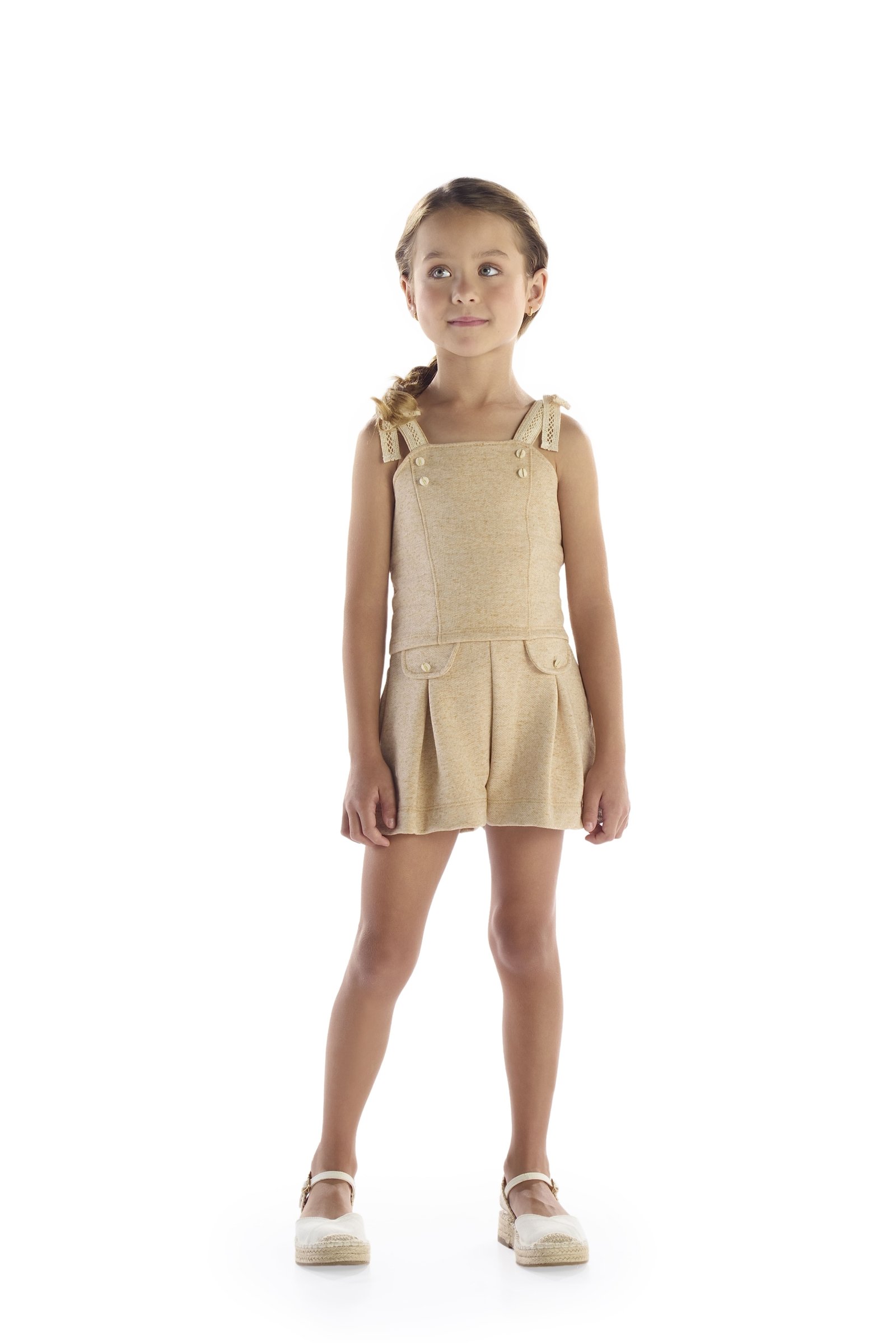 CONJUNTO NA COM BEGE COM BLUSA DE ALÇA COM DETALHES, SHORT COM PREGAS NA FRENTE