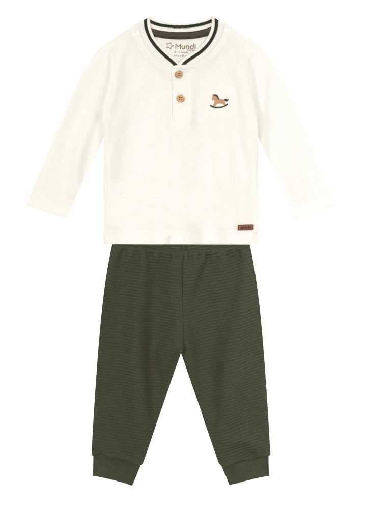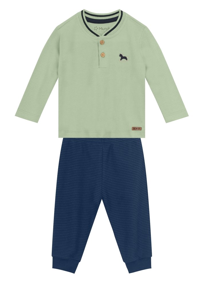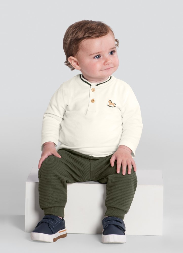 Conjunto bebê menino composto por camiseta confeccionada em piquet e calça jogger em moletinho canelado com estampa bordada de cavalo.