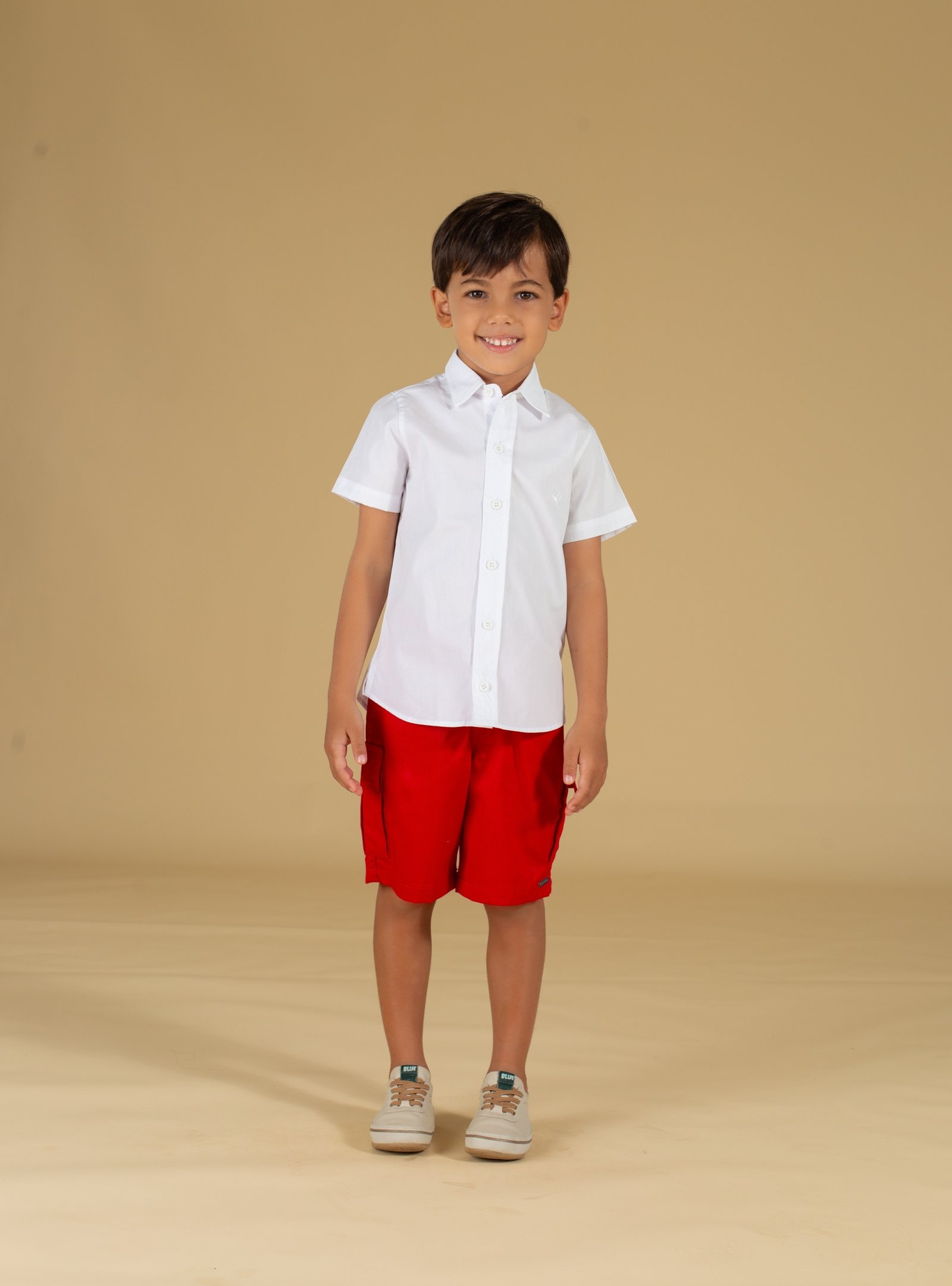 Conjunto infantil masculino, camisa em tecido de algodão, com gola e modelagem tradicional, manga curta, e botões na frente. Bermuda cargo em tecido de algodão, com bolso faca, zíper, cós com elástico, e bolsos nas laterais, modelagem confortável.