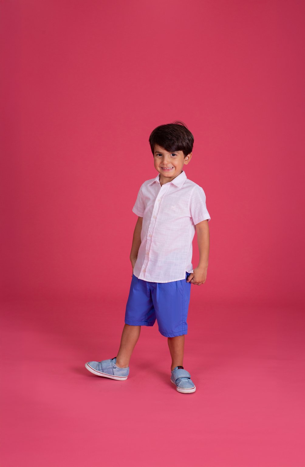 Conjunto infantil masculino, camisa em tecido 100% algodão, com gola e modelagem tradicional, manga curta e botões na frente. Bermuda com bolso faca, elástico regulável na cintura, modelagem confortável.