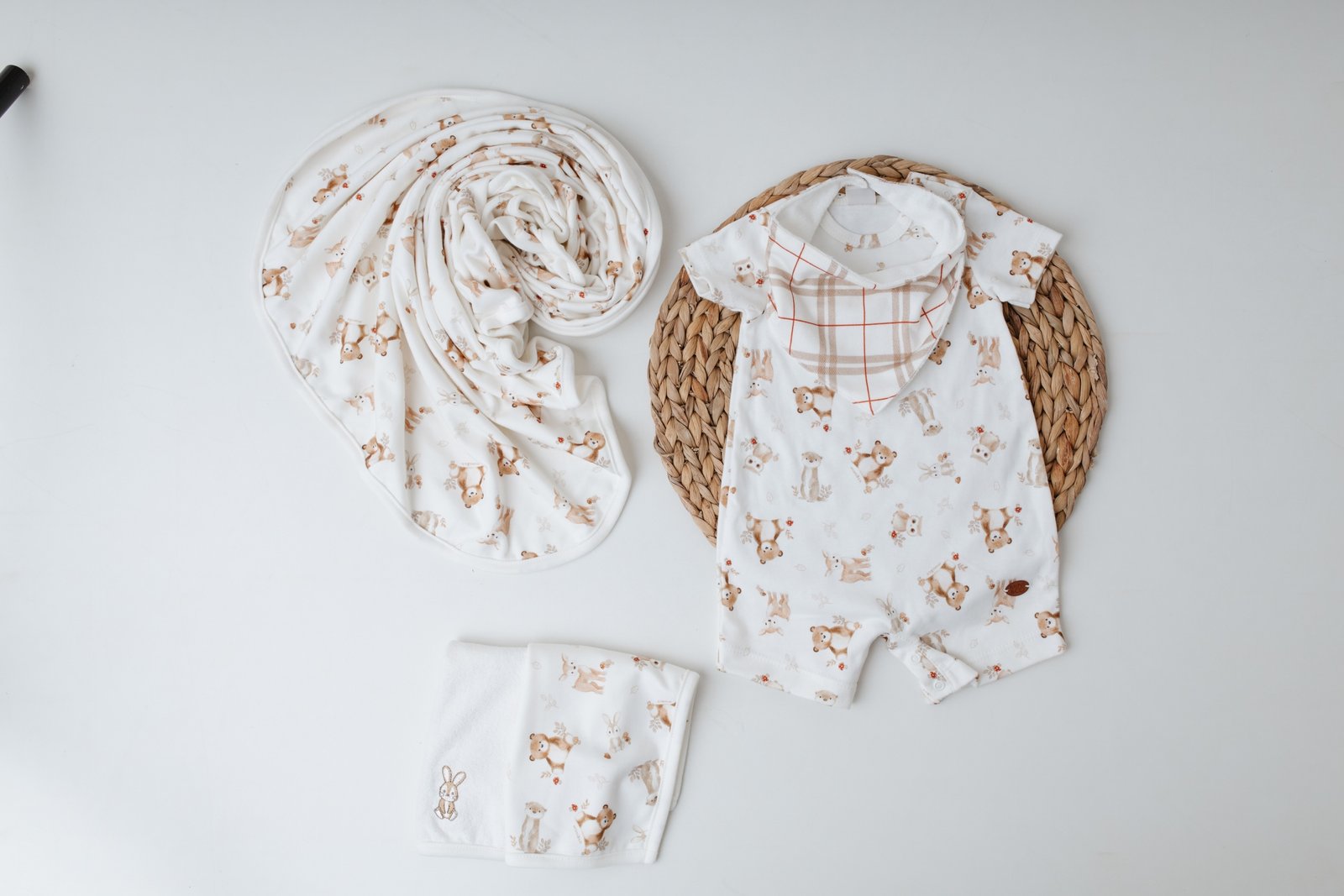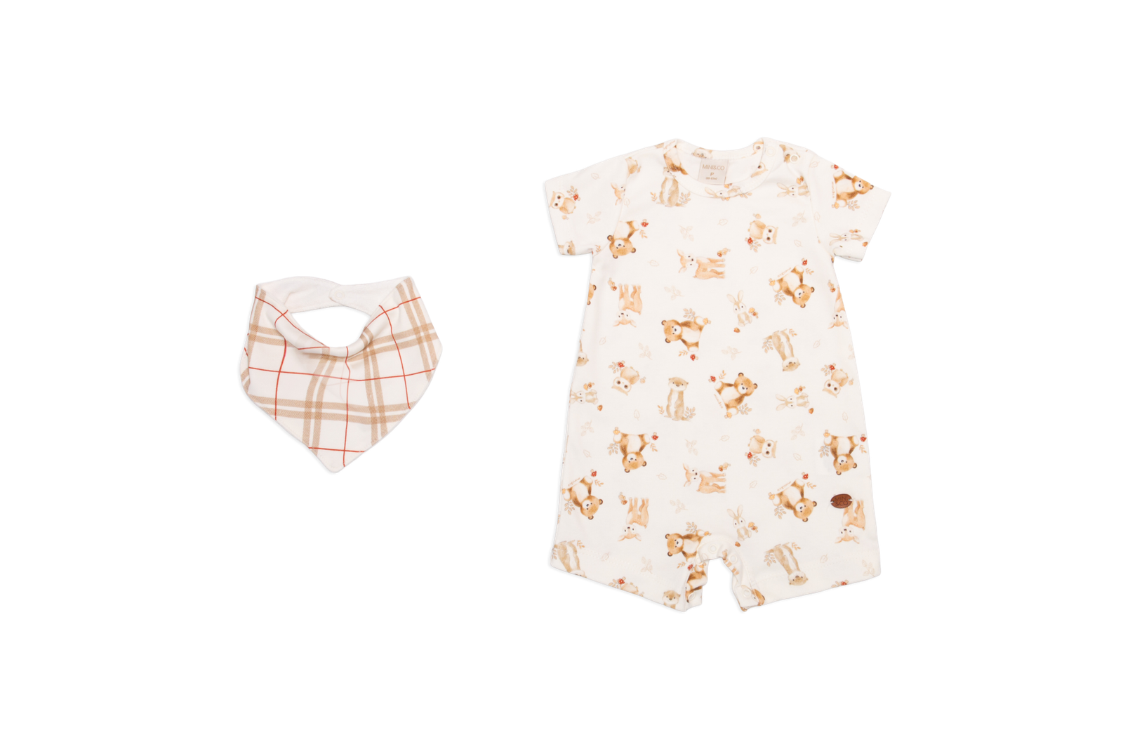• Macacão manga curta em algodão egípcio na cor marfim e estampa Forest