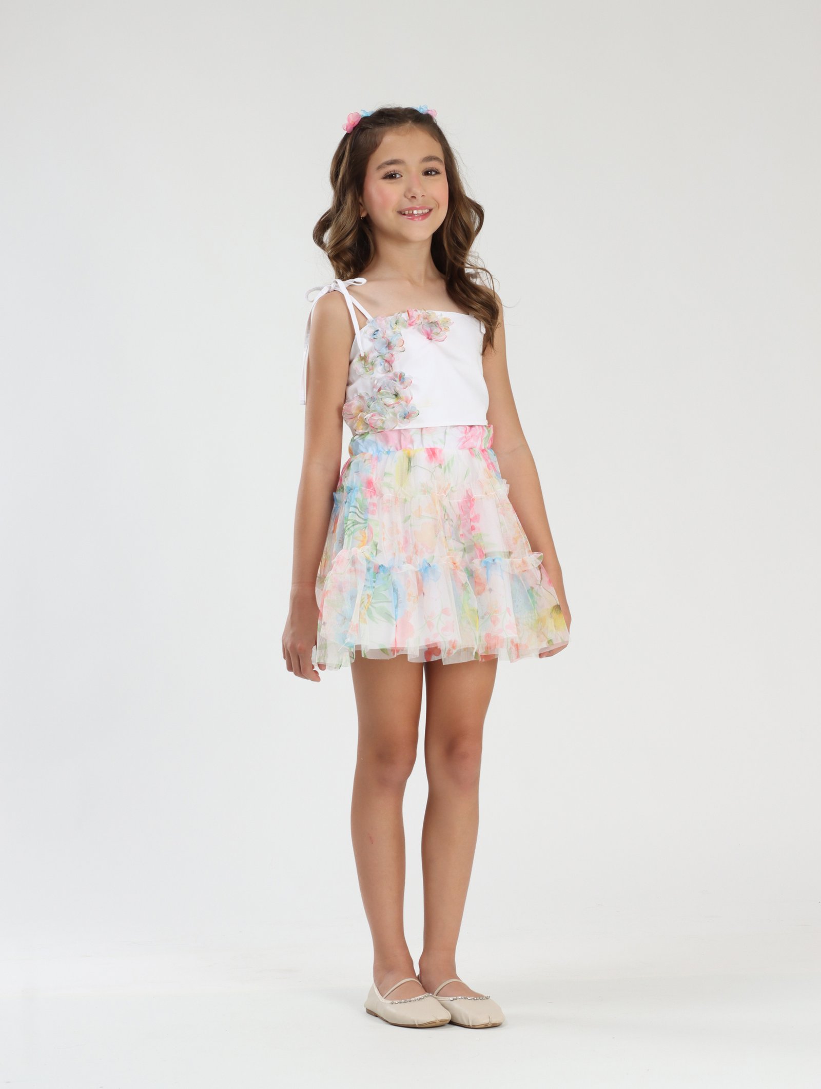 CONJUNTO CROPPED COM DETALHE EM APLICAÇÃO, ALÇAS DE AMARRAR, SAIA DE TULE ESTAMPADA