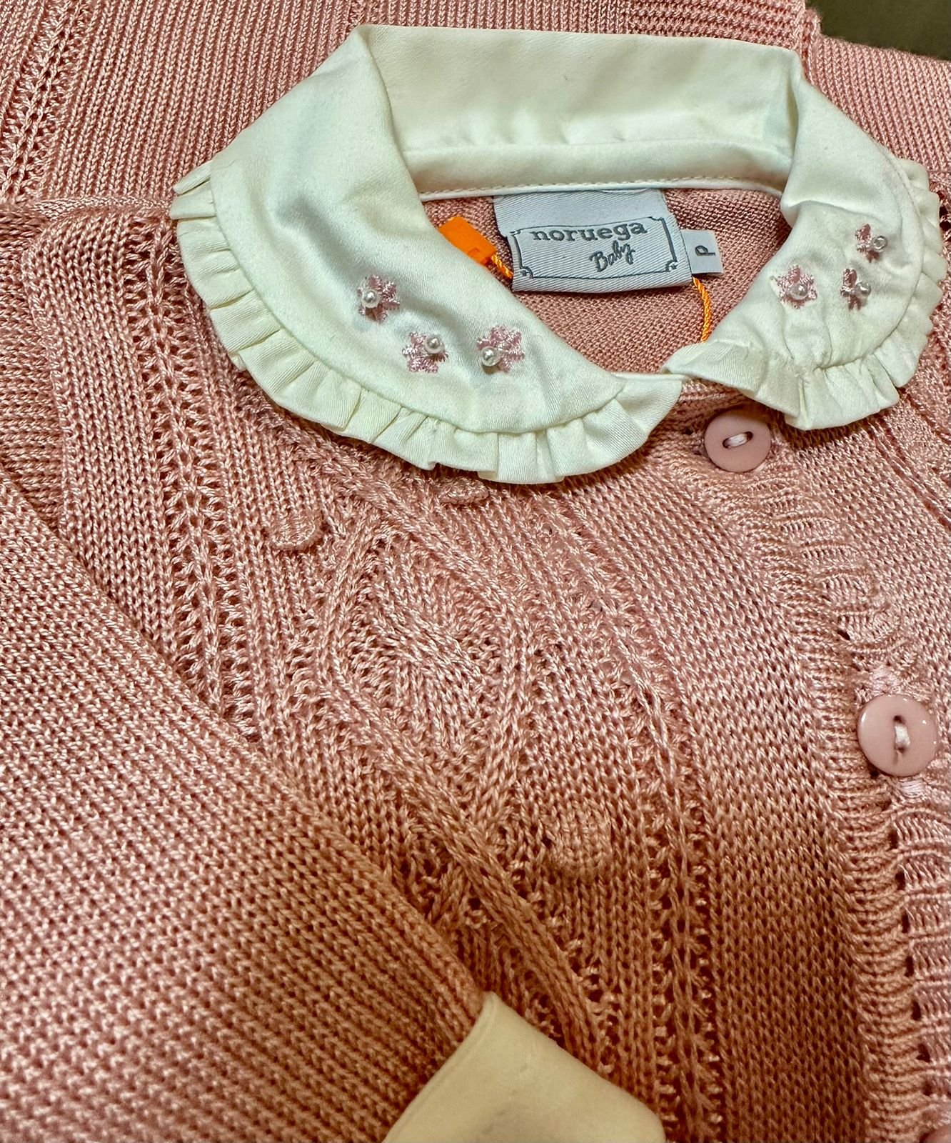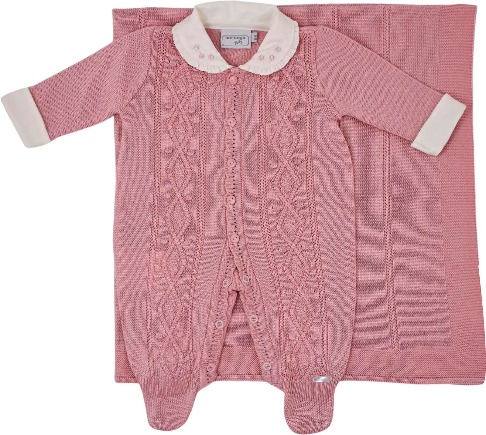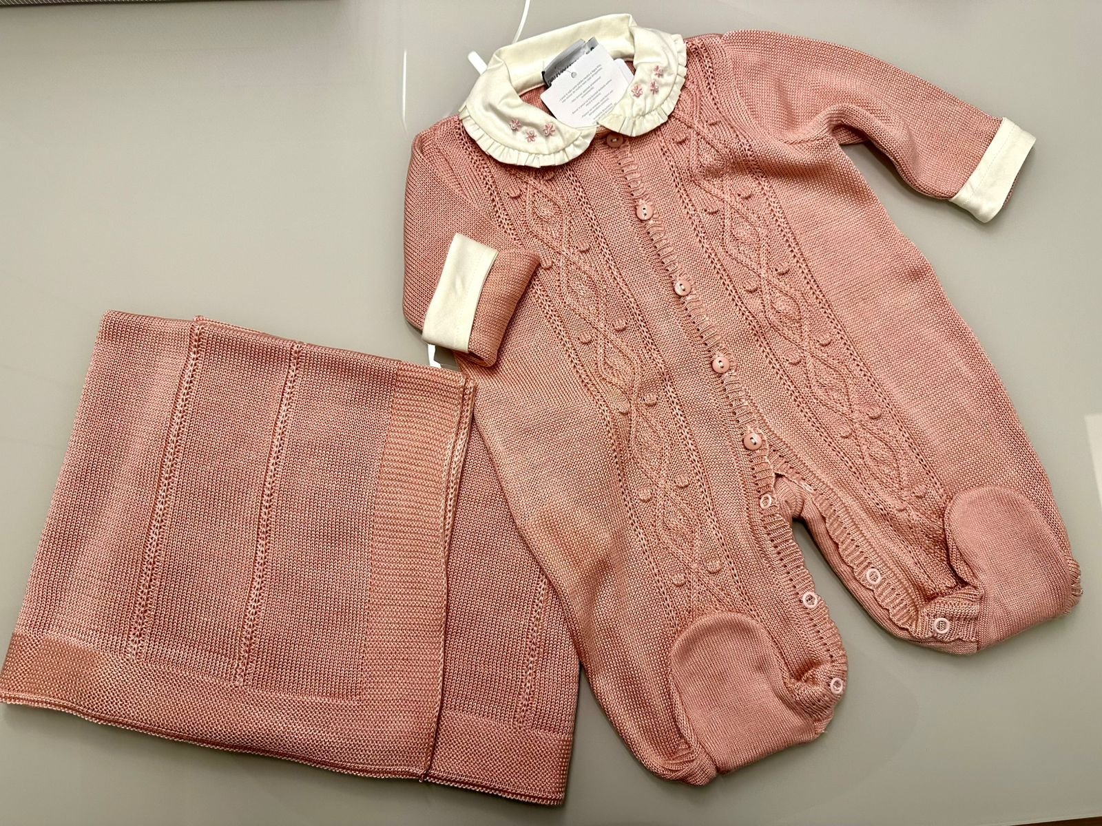 Nosso maravilhoso kit maternidade acompanha um belíssimo macacão em tricot, com bordado delicado na cola e uma manta com trama trabalhada.