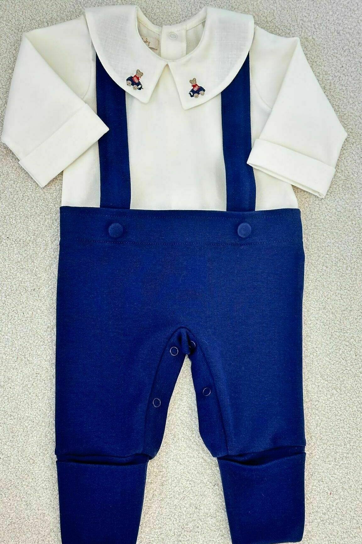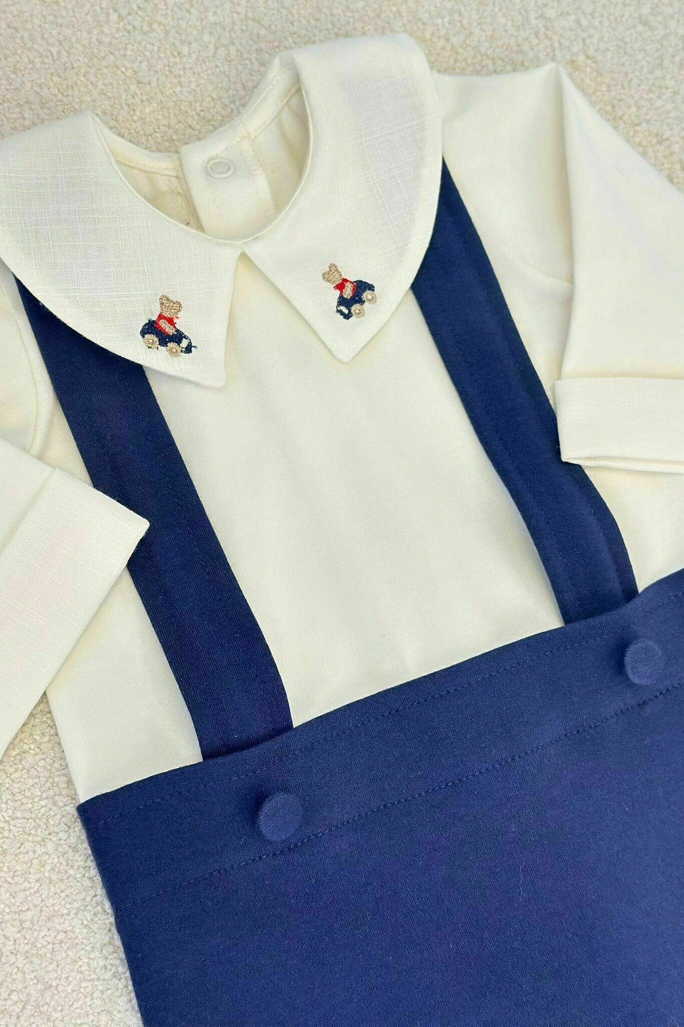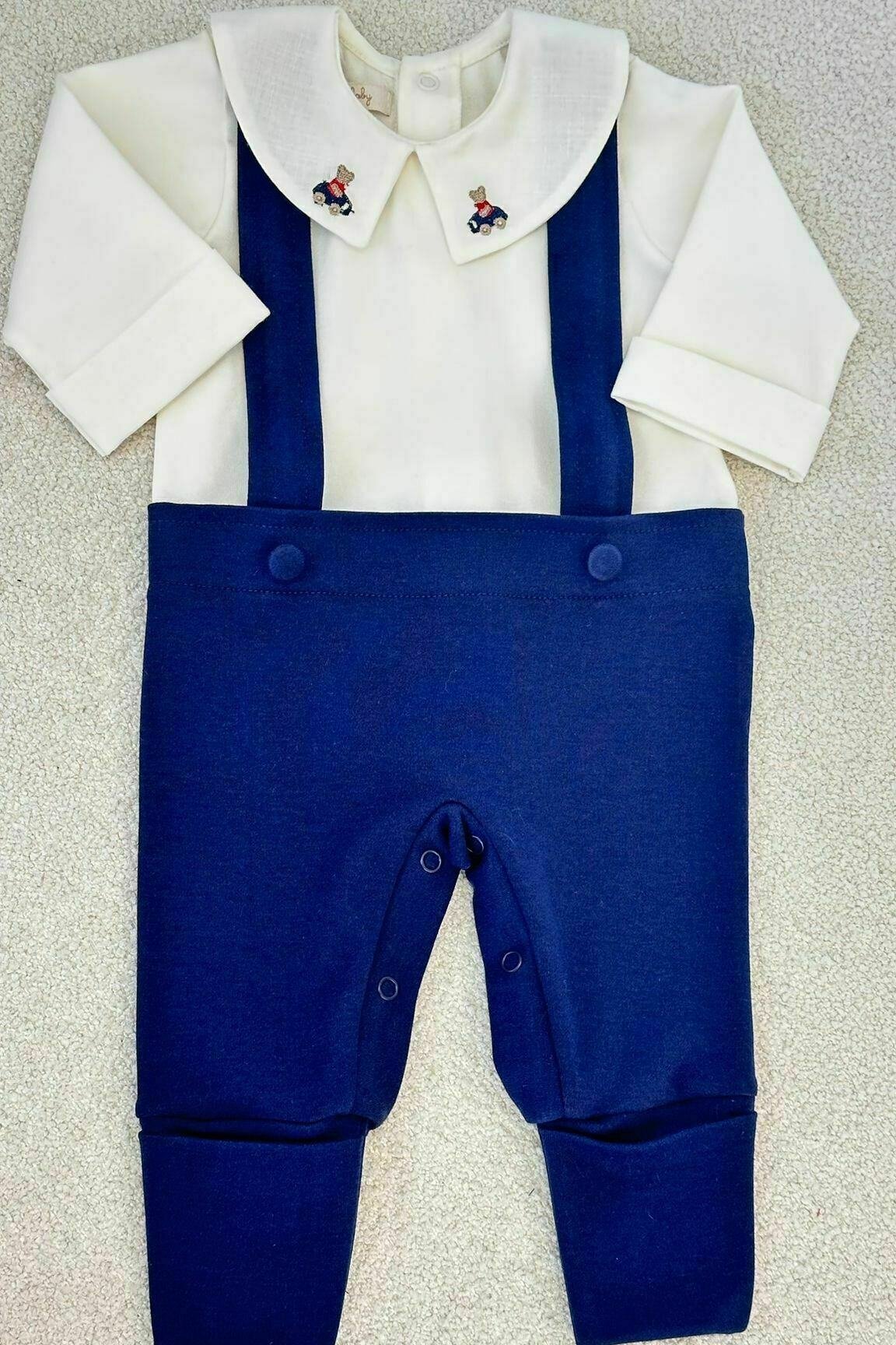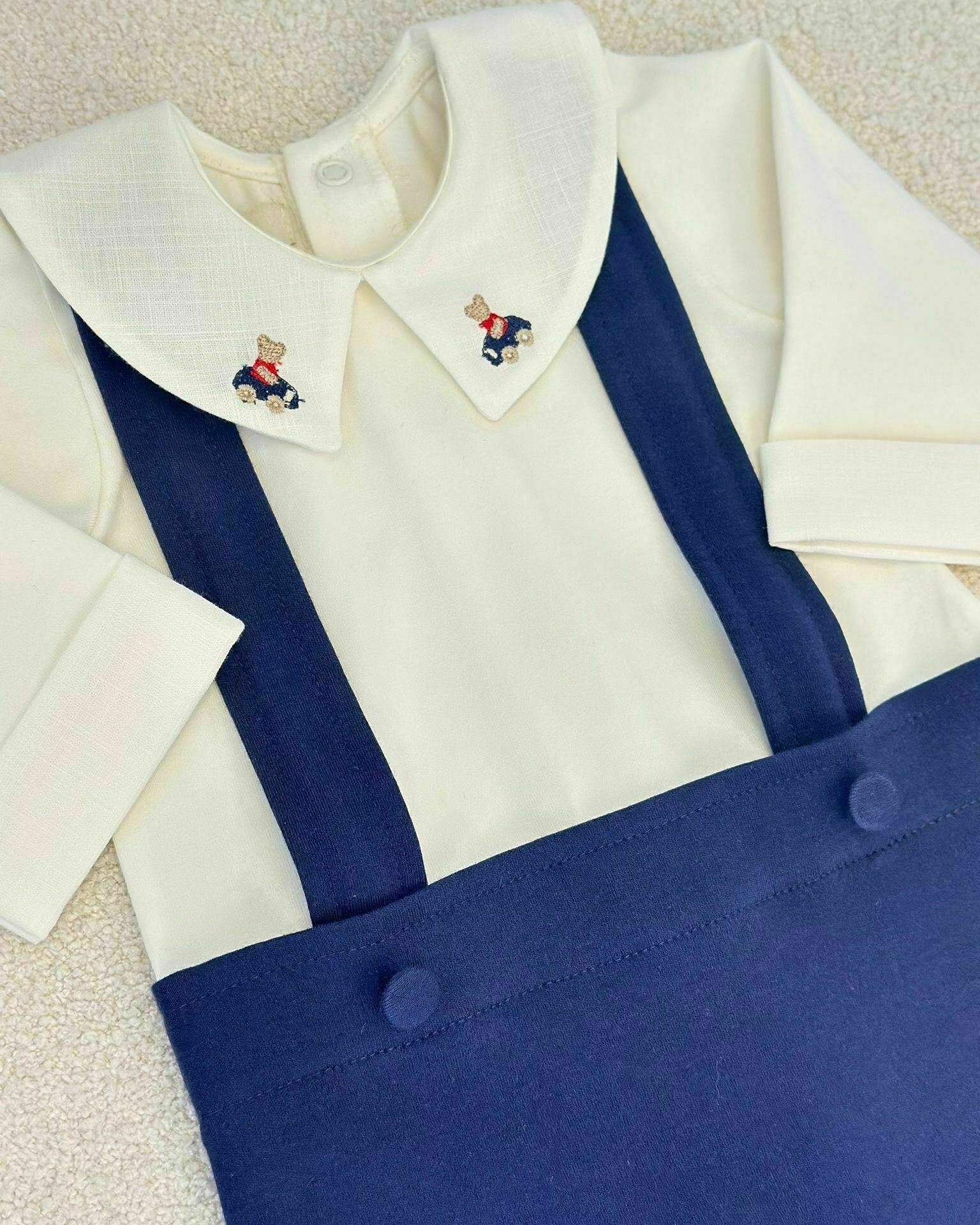 Macaquinho em sudine premium com gola bordada e suspensorios.