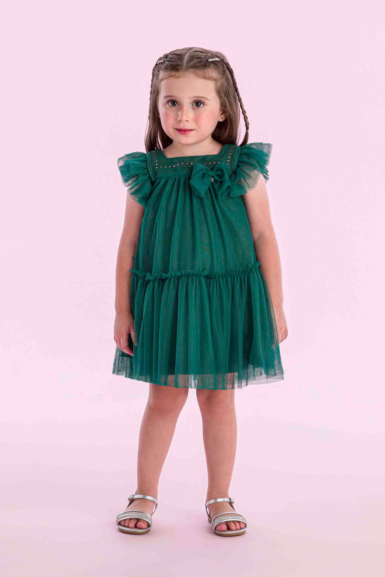 O vestido Petit Cherie é encantador e sofisticado, ideal para ocasiões especiais. Confeccionado em tule delicado, possui camadas que garantem movimento leve e gracioso. O modelo traz mangas com babadinhos em tule, gola com aplicação de pequenas pedrarias e um laço delicado na parte frontal, que adiciona charme romântico à peça. Com modelagem soltinha e confortável, é perfeito para vestir as pequenas princesas com elegância e estilo em momentos únicos.