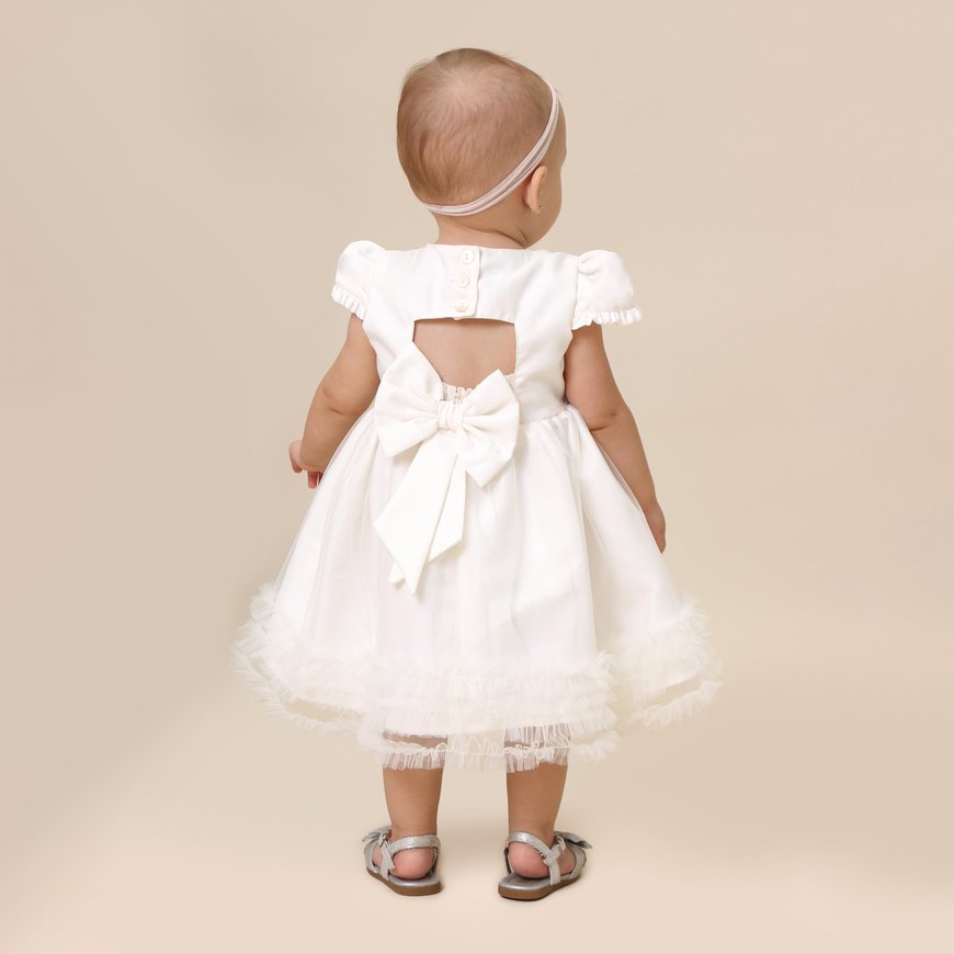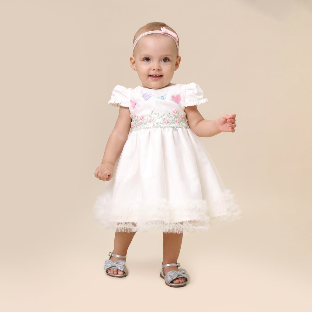 Vestido de tule com bordados de borboletas e aplicações