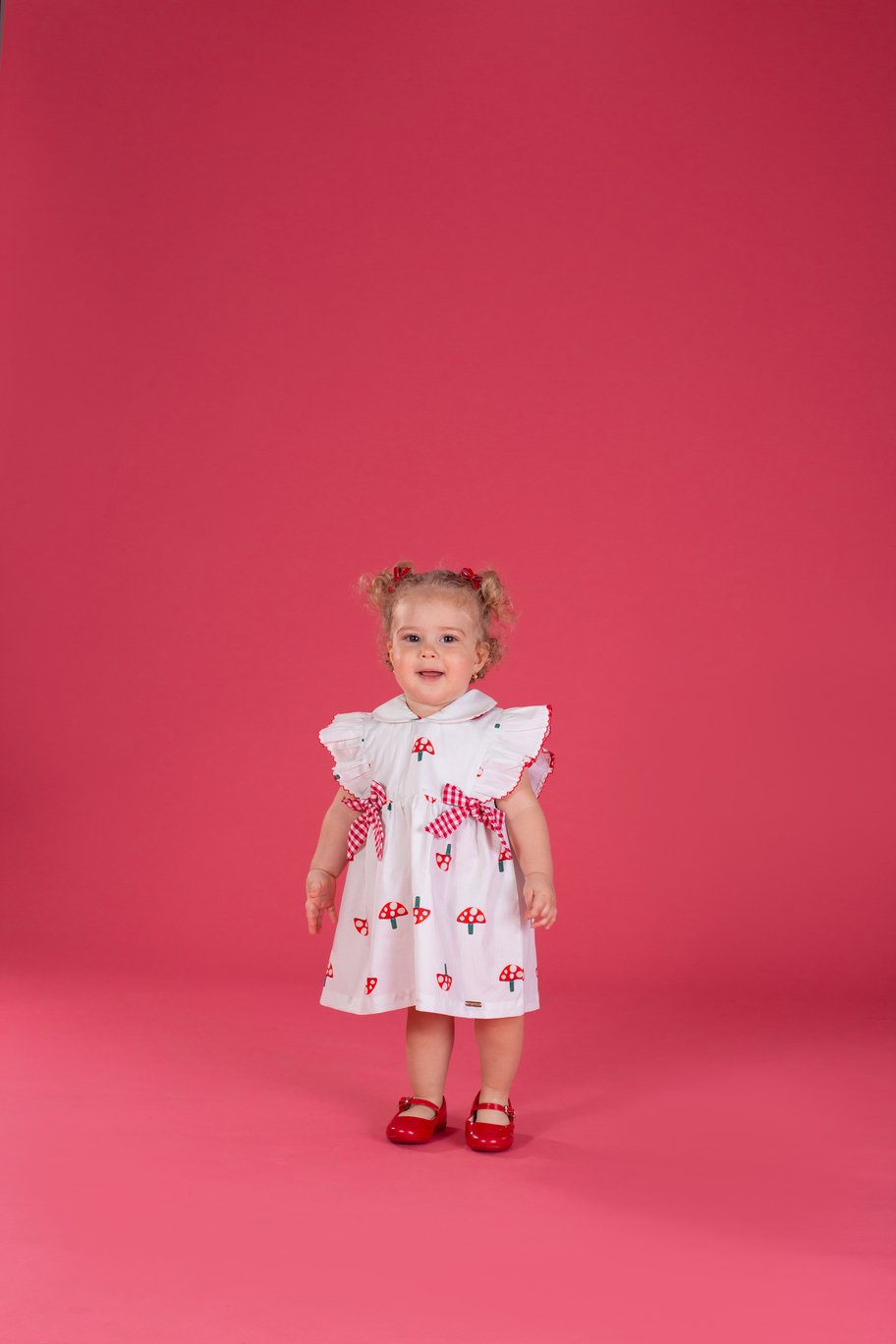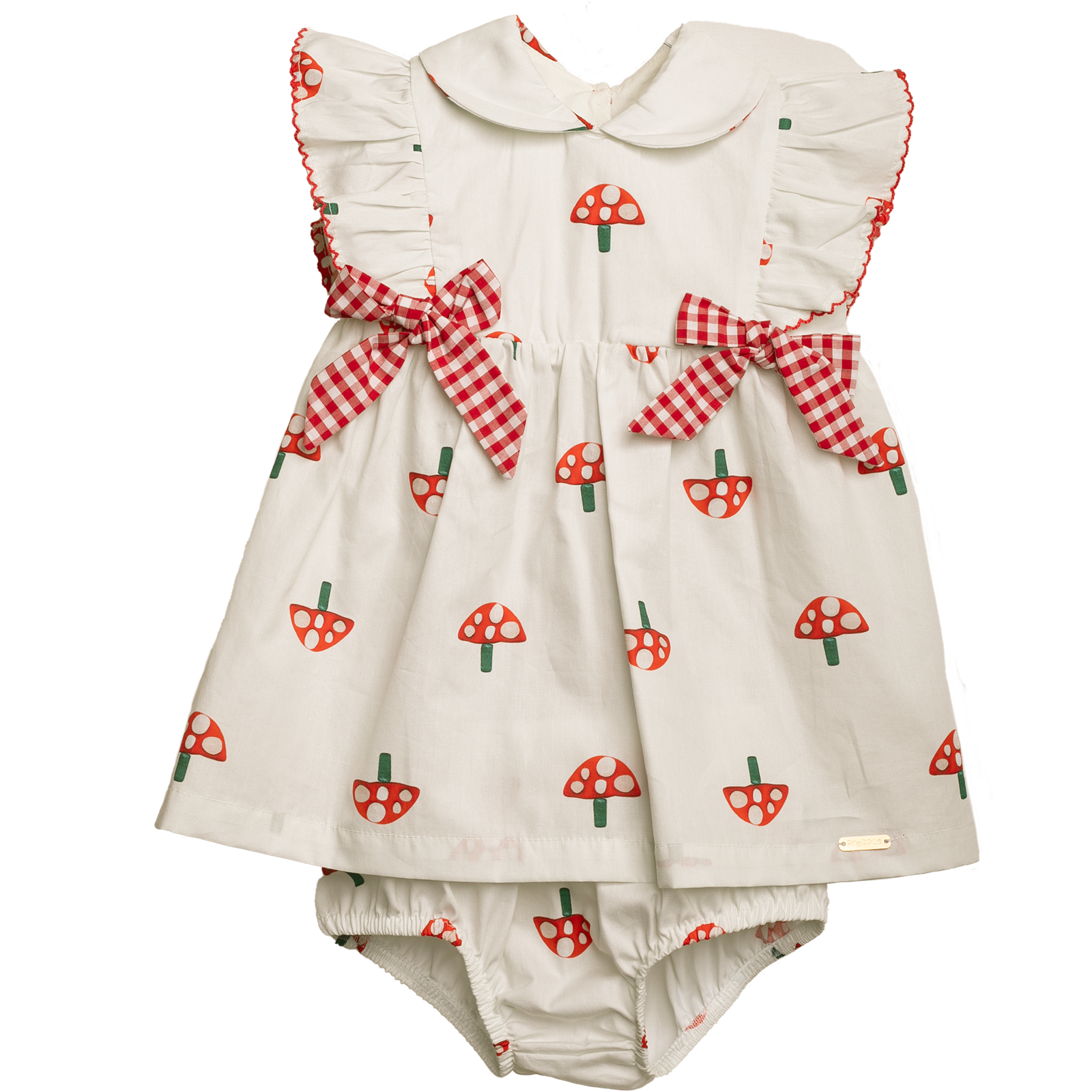 Vestido infantil em tecido de algodão, gola bebê, manga franzida, laço na cintura, saia franzindo e abrindo a roda do vestido, abotoamento nas costas. Calcinha com elástico na cintura e pernas. Feito com a estampa exclusiva “COGUMELO FUNDO OFF”.