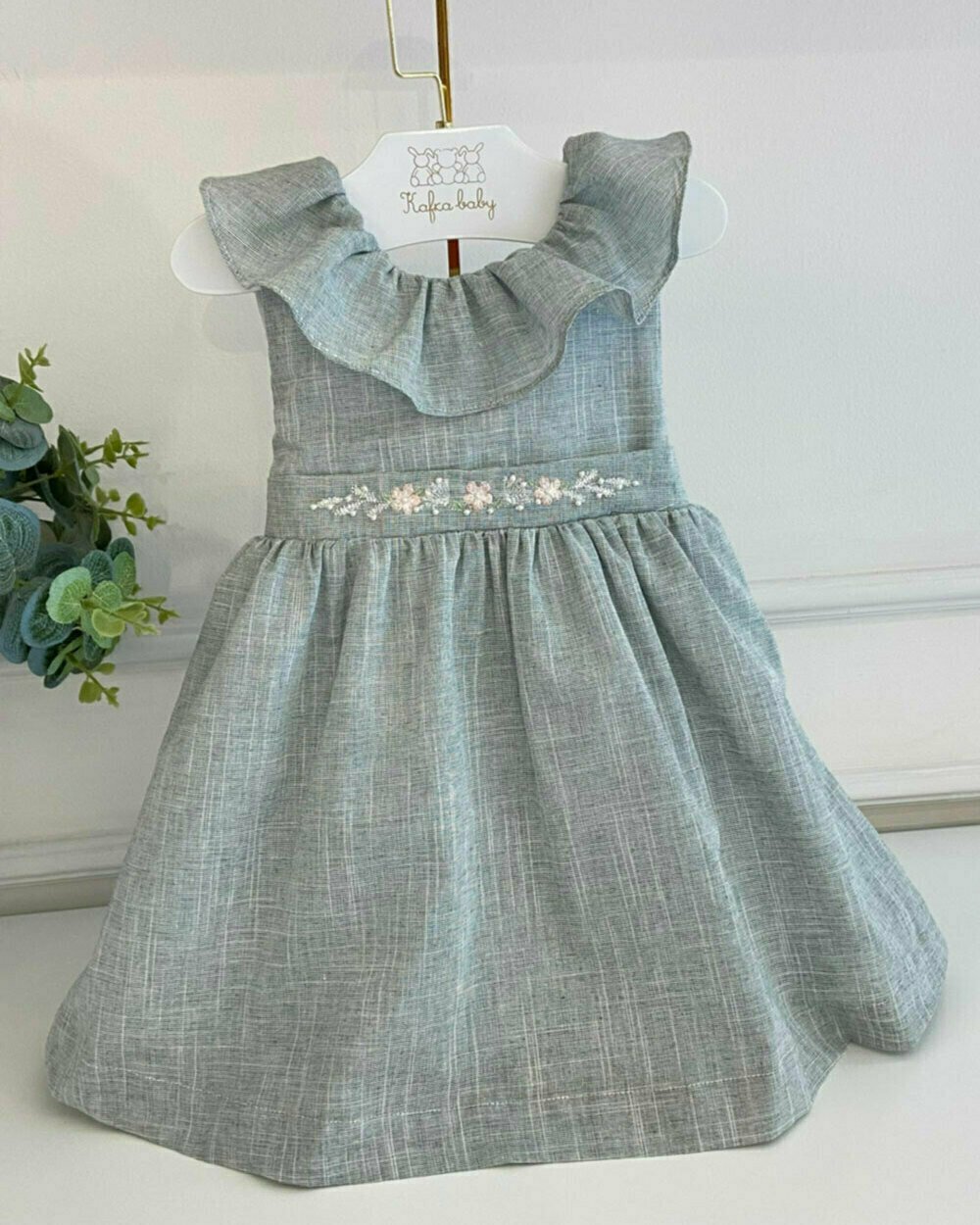 Vestido com gola babados e bordados com aplicação em pérolas