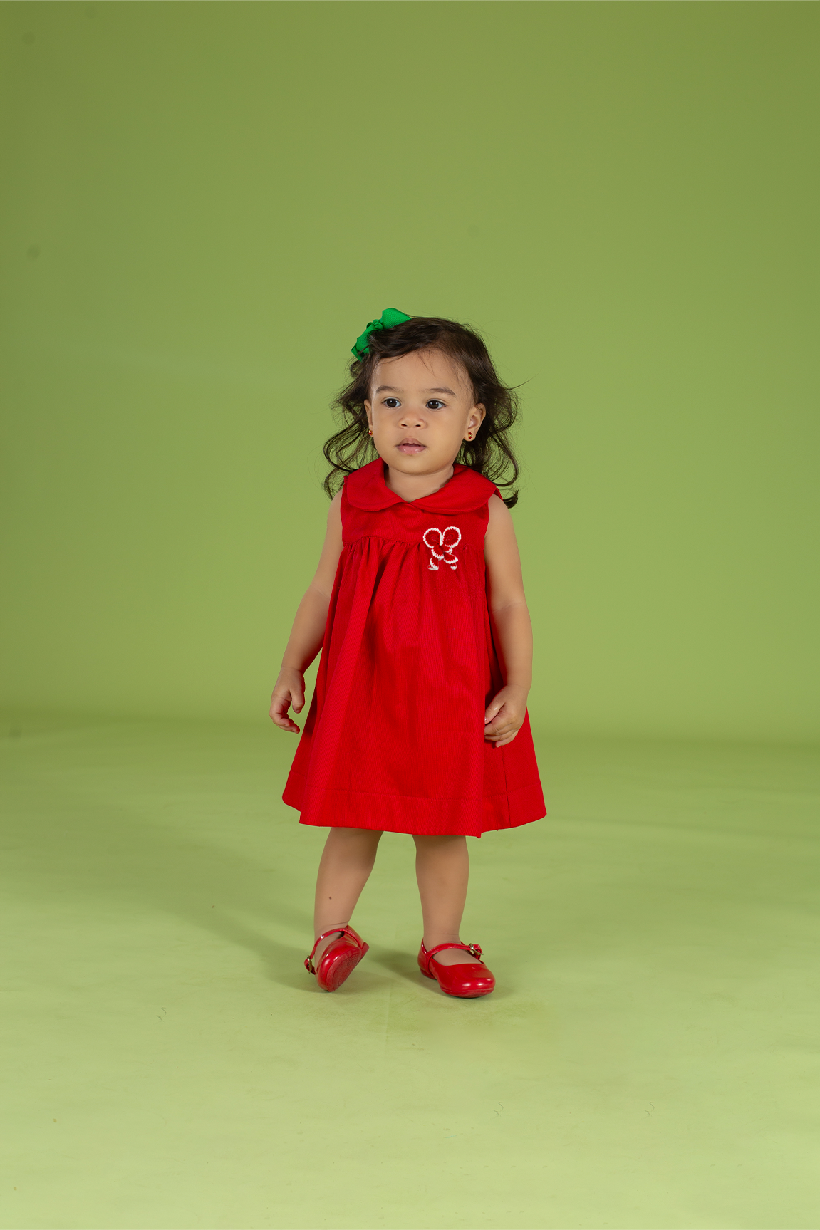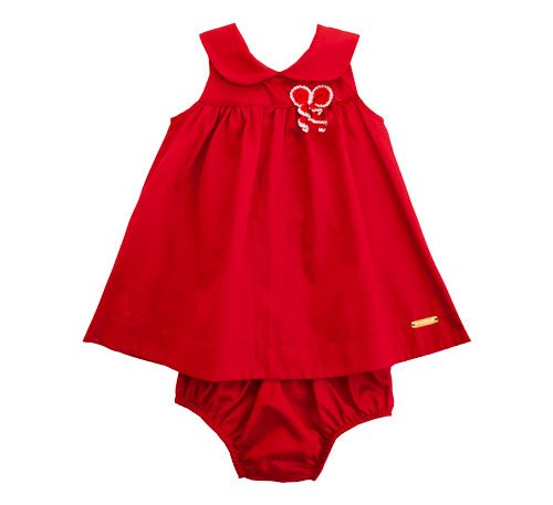 Vestido infantil em tecido de algodão com leve textura, gola bebê, pala pequena franzida e abrindo a roda do vestido, abotoamento nas costas, bordado de crochê, modelagem soltinha e confortável.